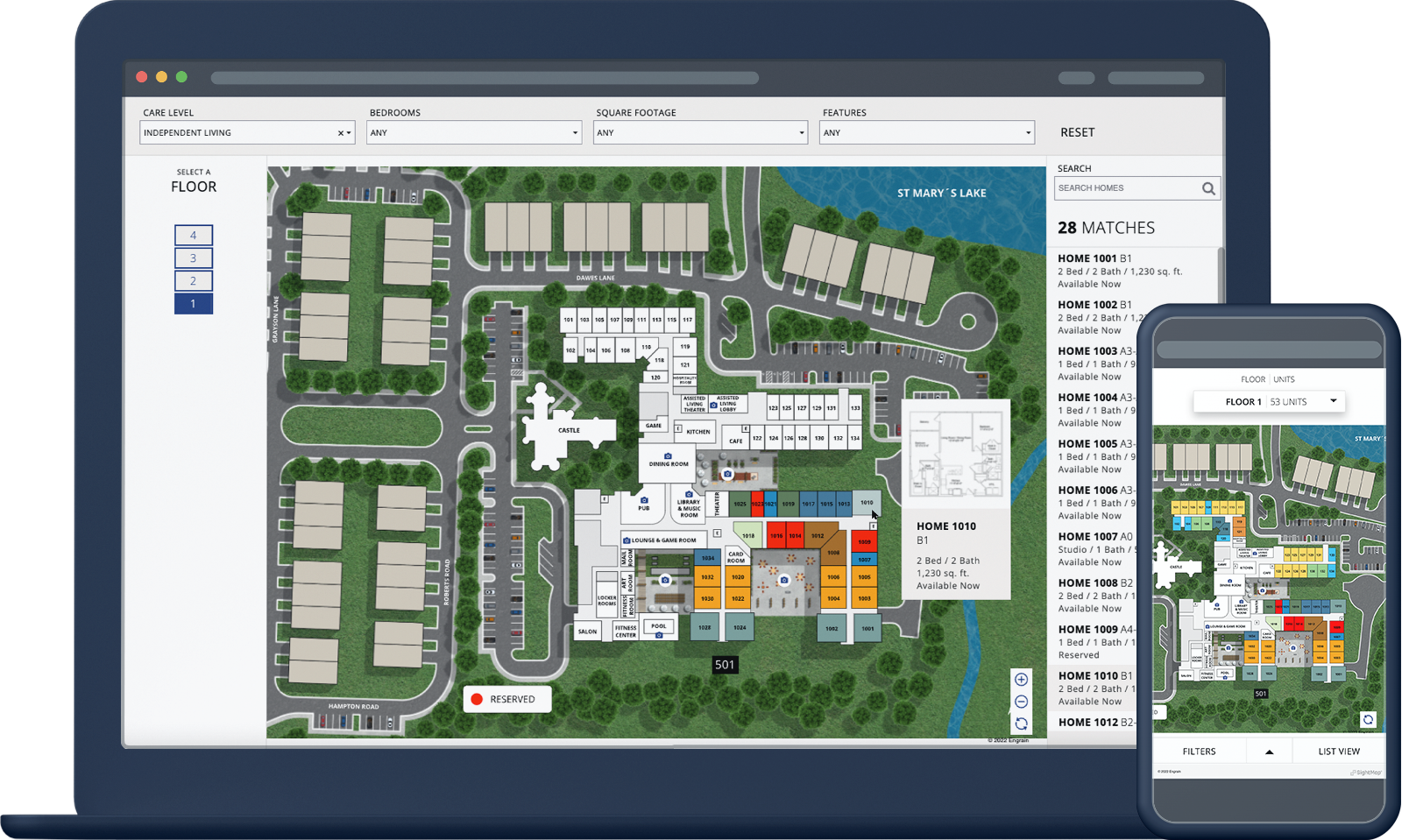 With SightMap, you can showcase your unique amenities, home types, property layout, and more to help prospective residents envision your community’s lifestyle. Empower prospective residents and their families to select homes based on their criteria by filtering down to their unique preferences such as apartment size, level of care, floorpan, home type, view and more.