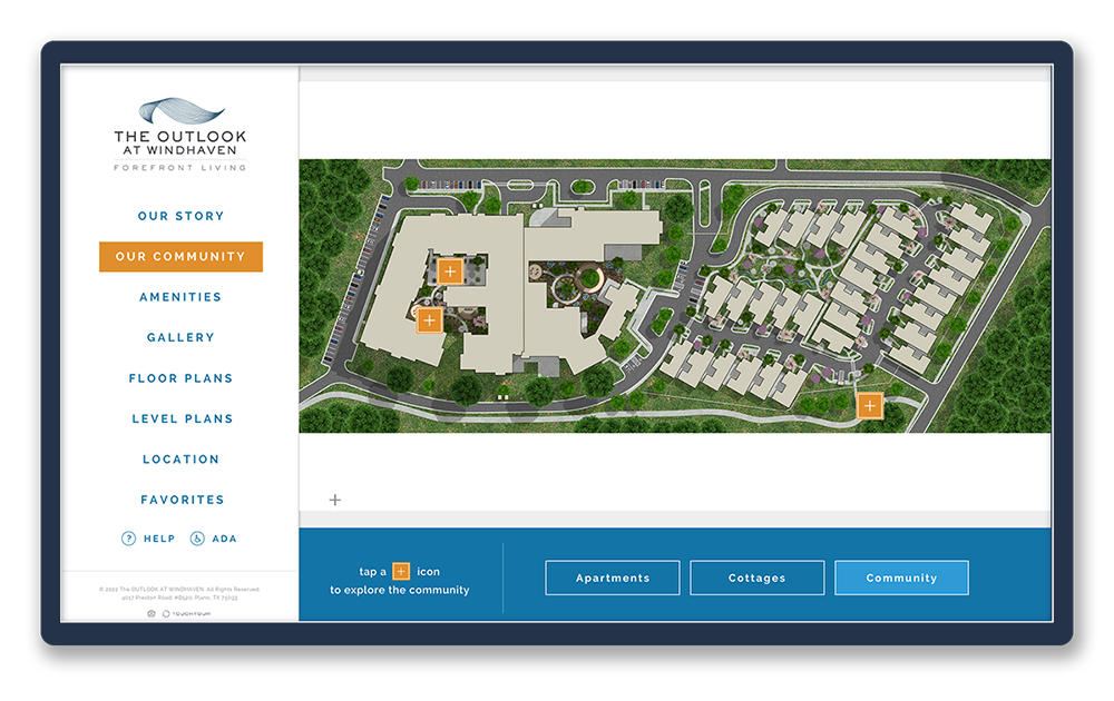 Create a TouchTour that is reflective of your property with unique branding, imagery, content, and layouts. Adjusted to fit the needs of your community, TouchTour has a variety of screen sizes and the ability to tailor the experience to any work flow.